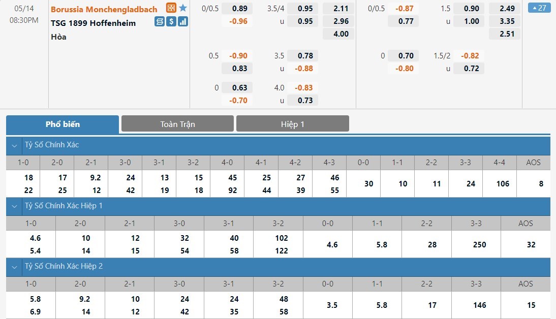Tỷ lệ kèo cá cược bóng đá trận Borussia M.Gladbach vs Hoffenheim