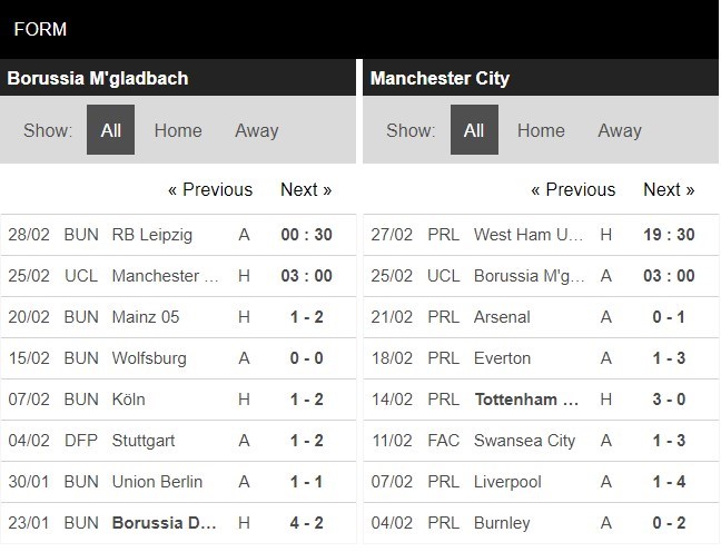 Thống kê phong độ Borussia M.Gladbach vs Manchester City