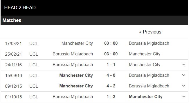 Thống kê đối đầu Borussia M.Gladbach vs Manchester City