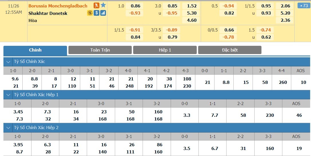 Xem tỷ lệ kèo cá cược bóng đá trực tuyến Borussia M’gladbach vs Shakhtar Donetsk