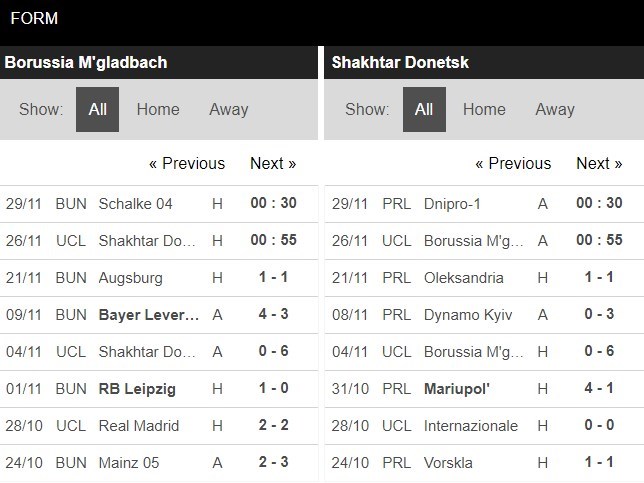 Thống kê phong độ Borussia M’gladbach vs Shakhtar Donetsk