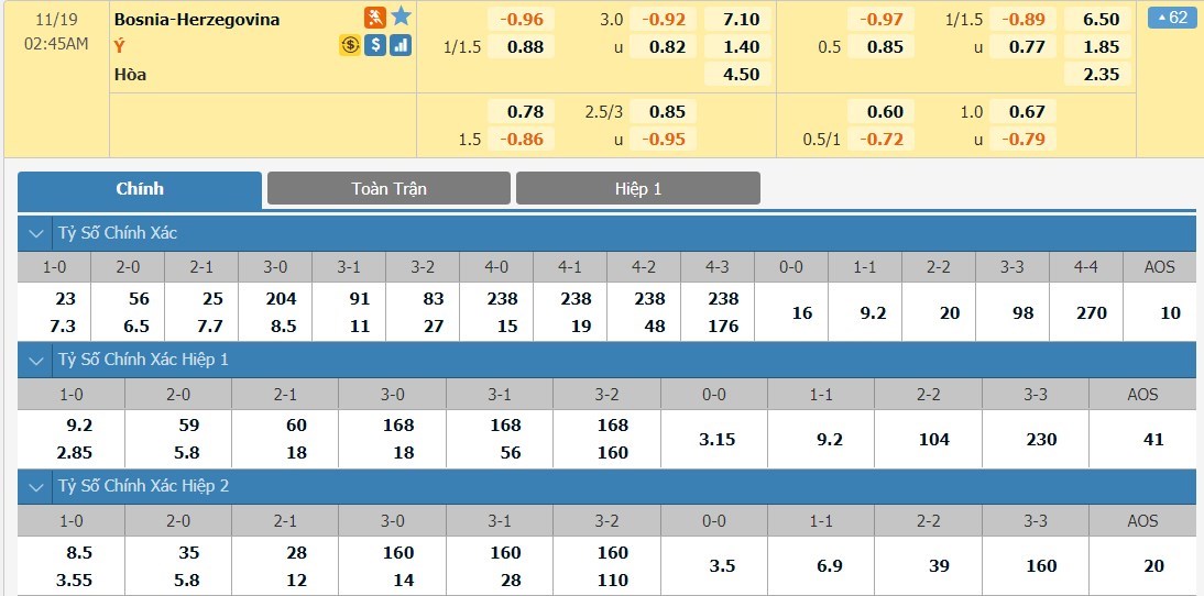 Xem tỷ lệ kèo cá cược bóng đá trực tuyến Bosnia Herzegovina vs Italia