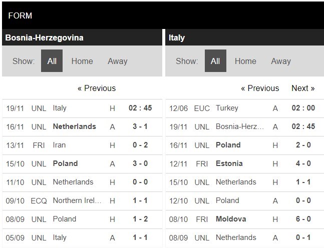 Thống kê phong độ Bosnia Herzegovina vs Italia