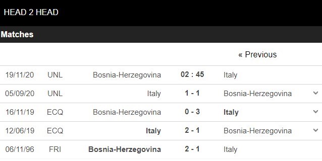 Thống kê đối đầu Bosnia Herzegovina vs Italia
