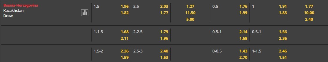 Tỷ lệ kèo cá cược bóng đá trận Bosnia & Herzegovina vs Kazakhstan