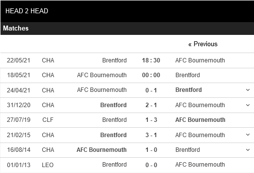 Thống kê đối đầu Bournemouth vs Brentford