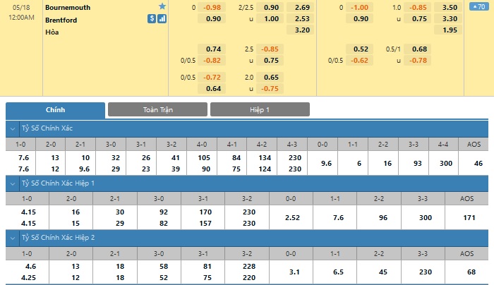 Xem tỉ lệ kèo cá cược bóng đá trực tuyến Bournemouth vs Brentford