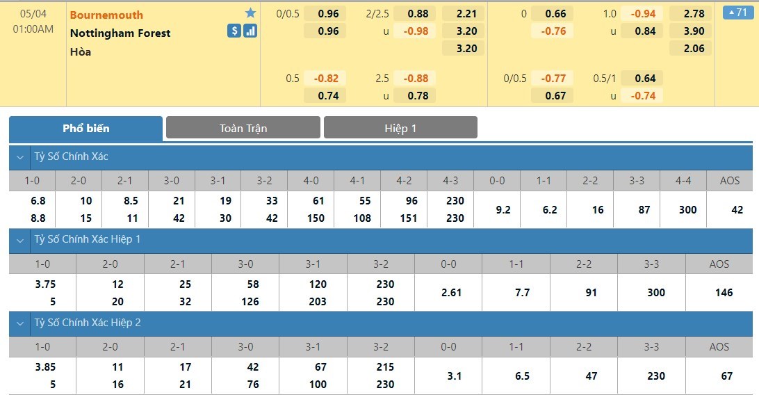 Tỷ lệ kèo cá cược bóng đá trực tuyến trận Bournemouth vs Nottingham