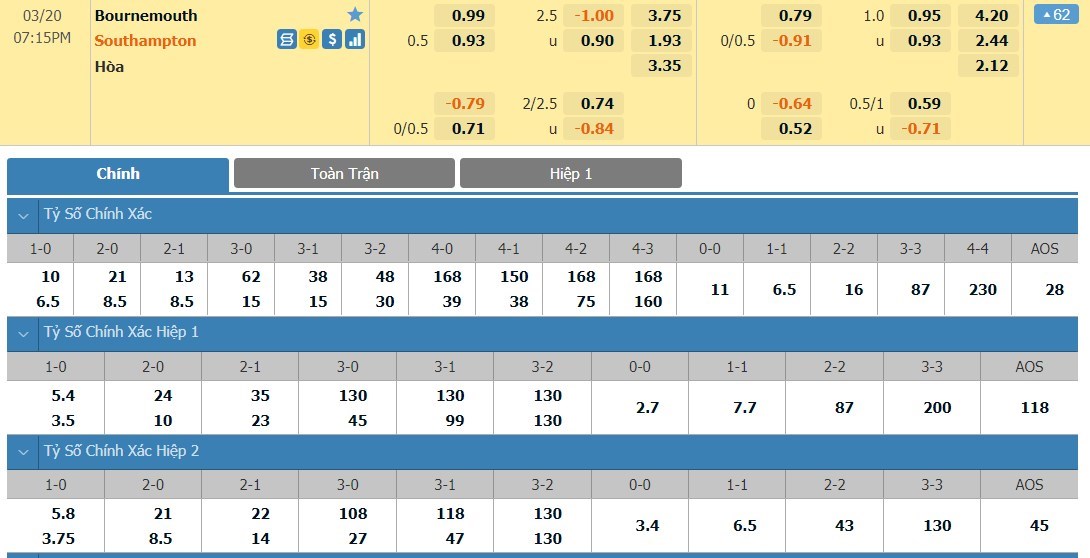 Xem tỷ lệ kèo cá cược bóng đá trực tuyến Bournemouth vs Southampton
