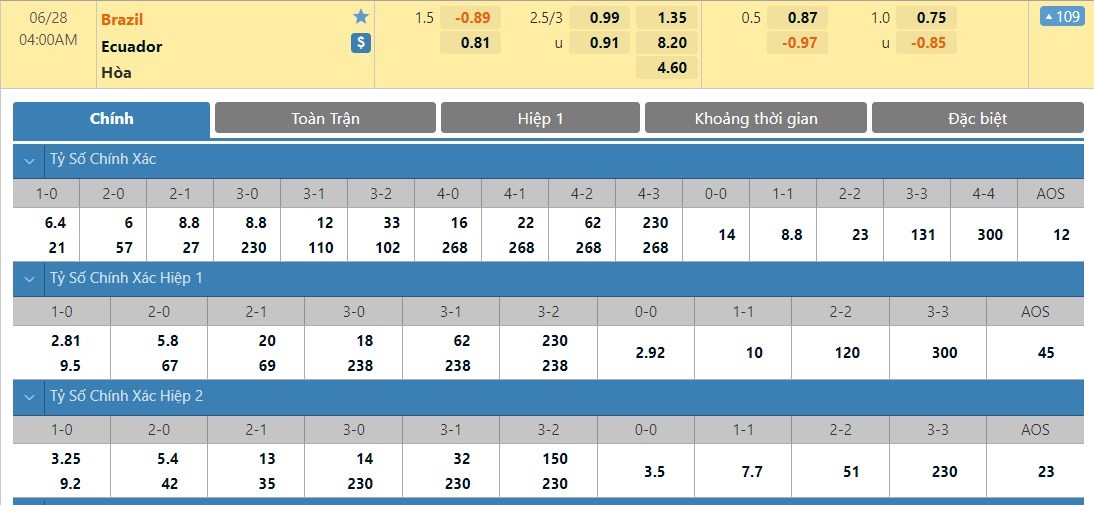 Tỷ lệ kèo cá cược bóng đá trực tuyến trận Brazil vs Ecuador