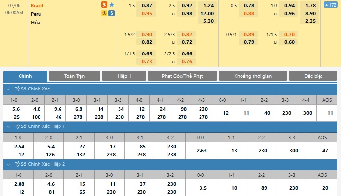 Xem tỉ lệ kèo cá cược bóng đá trực tuyến Brazil vs Peru