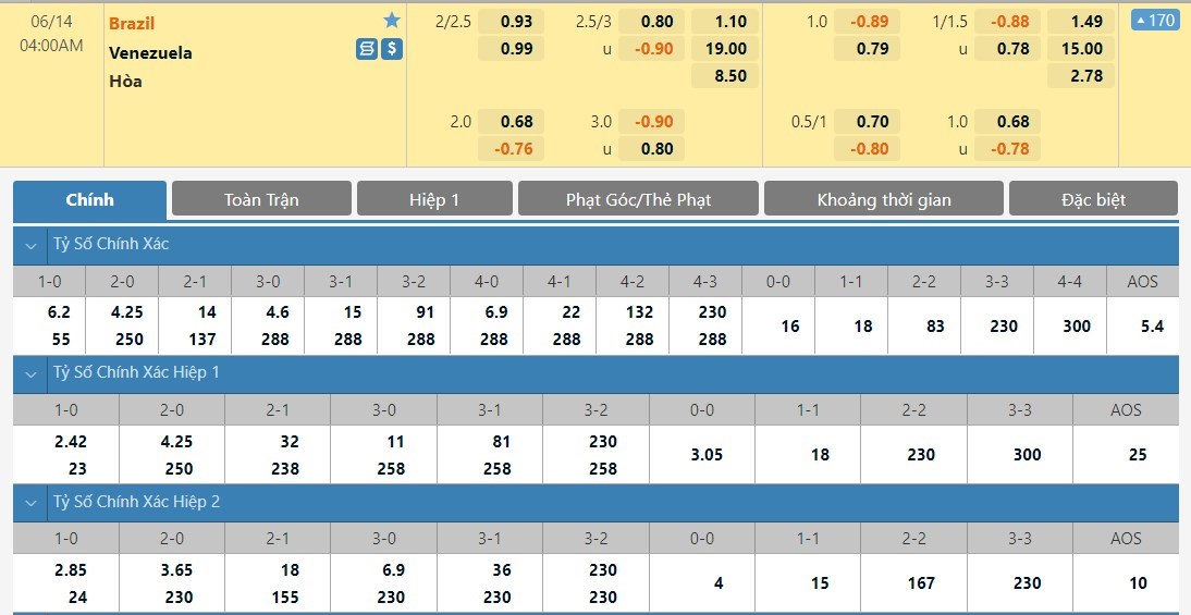 Tỷ lệ kèo cá cược bóng đá trực tuyến trận Brazil vs Venezuela