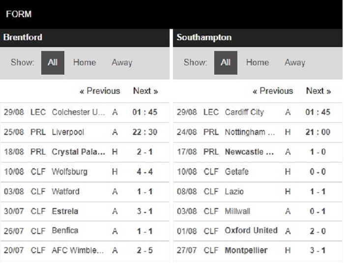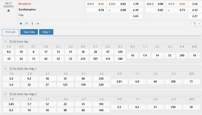Xem tỷ lệ kèo cá cược bóng đá trực tuyến Brentford vs Southampton
