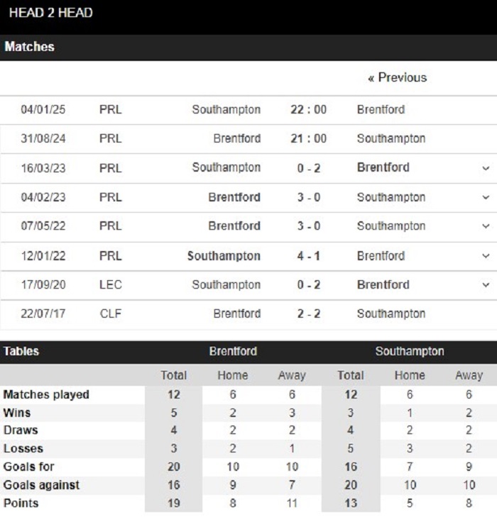 Brentford và Southampton đã chạm trán với nhau 10 lần kể từ năm 2009 đến nay. Kết quả đang nghiêng về phía Brentford khi đội bóng này thắng 5, hòa 3 và chỉ có 2 chiến thắng dành cho Southampton. Trong cả 3 lần chạm trán gần nhất, Brentford đều giành phần thắng.