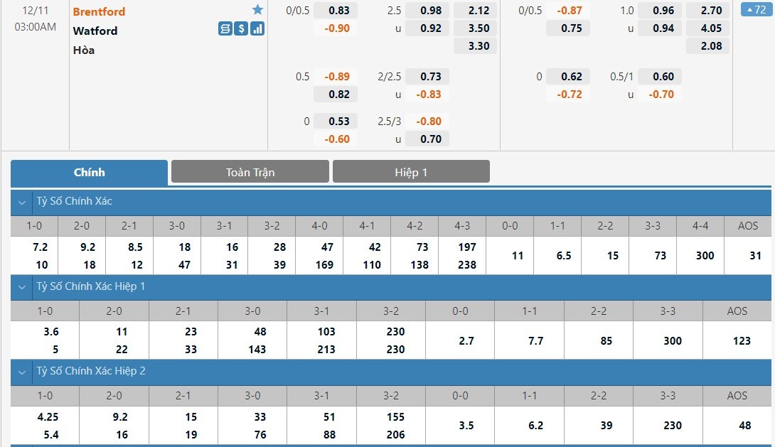 Tỷ lệ kèo cá cược bóng đá trận Brentford vs Watford