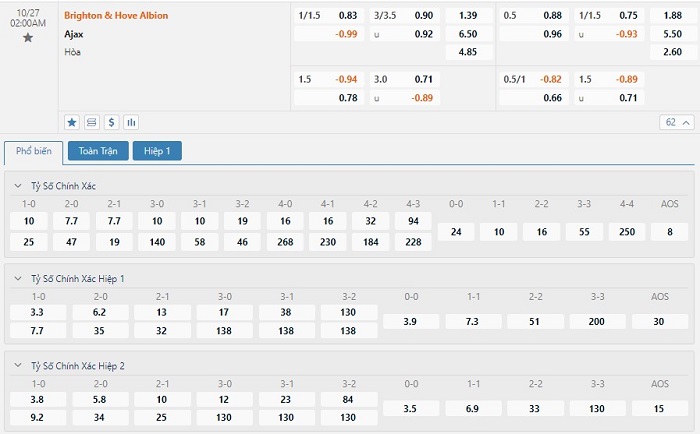 Tỷ lệ kèo cá cược bóng đá trực tuyến trận Brighton vs Ajax