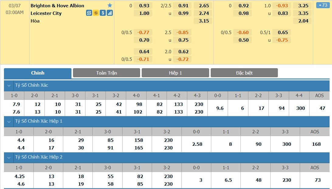 Xem tỷ lệ kèo cá cược bóng đá trực tuyến Brighton vs Leicester City