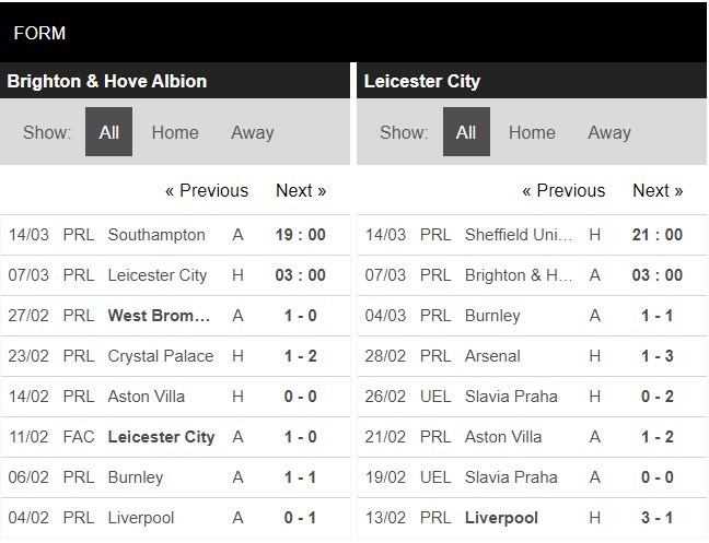Thống kê phong độ Brighton vs Leicester City