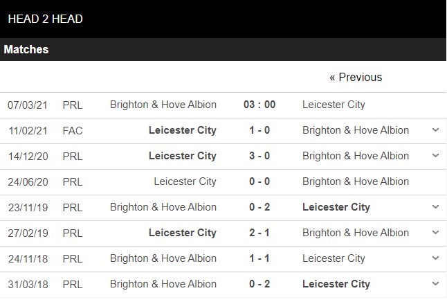 Thống kê đối đầu Brighton vs Leicester City
