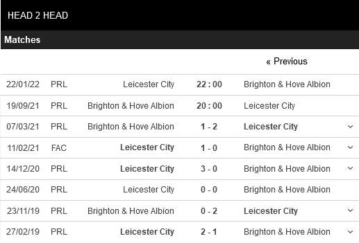 Thống kê đối đầu Brighton vs Leicester City
