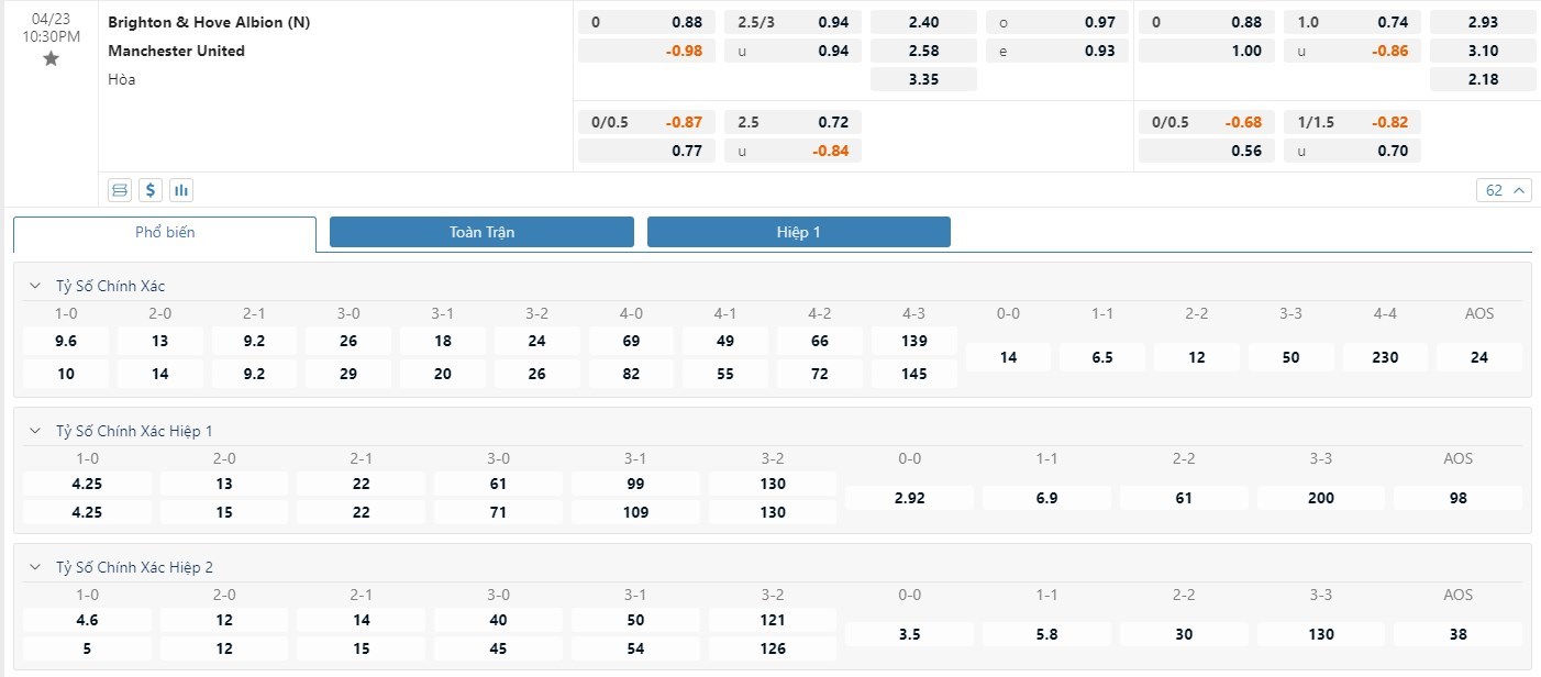 Xem tỷ lệ kèo cá cược bóng đá trực tuyến Brighton vs Manchester United