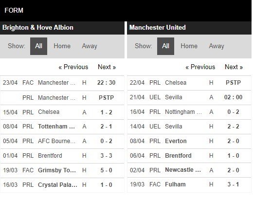Thống kê phong độ Brighton vs Manchester United