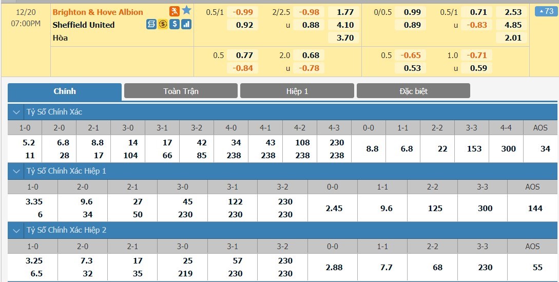 Tỷ lệ kèo cá cược bóng đá trực tuyến trận Brighton vs Sheffield United