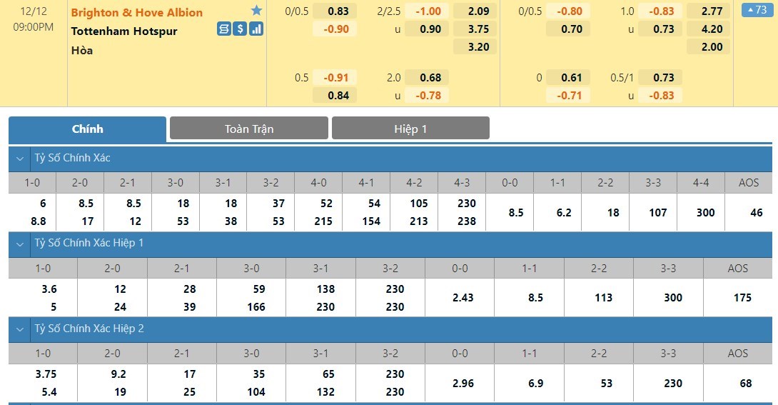 Tỷ lệ kèo cá cược bóng đá trực tuyến trận Brighton vs Tottenham