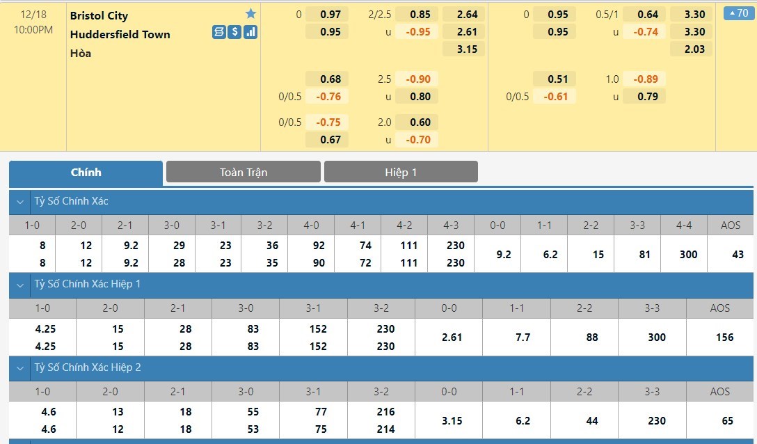 Tỷ lệ kèo cá cược bóng đá trận Bristol City vs Huddersfield