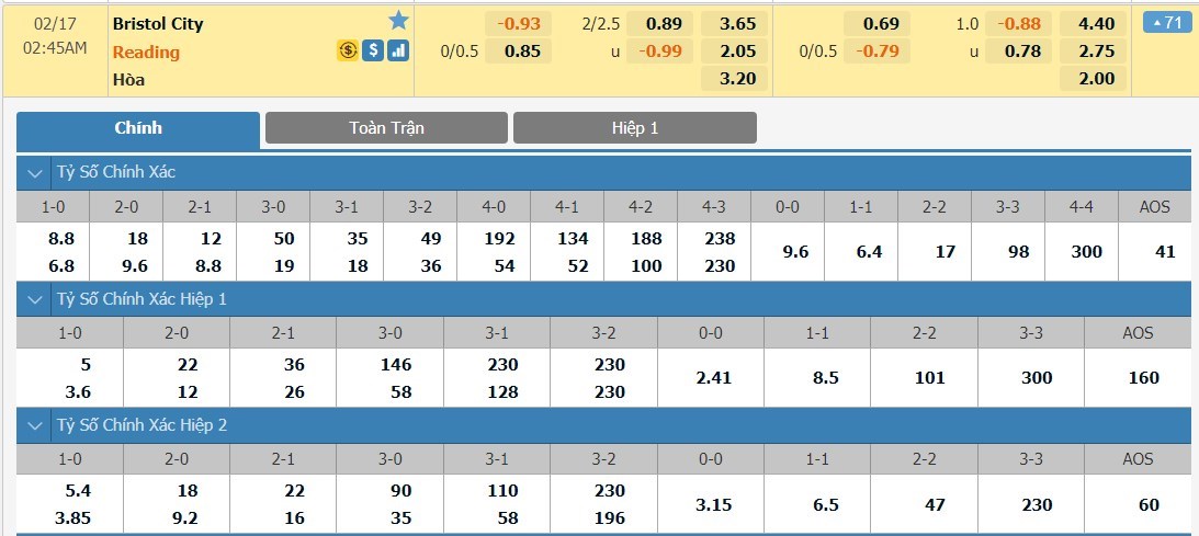 Tỷ lệ kèo cá cược bóng đá trận Bristol City vs Reading