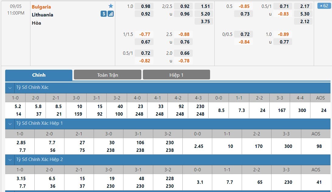 Tỷ lệ kèo cá cược bóng đá trận Bulgaria vs Lithuania