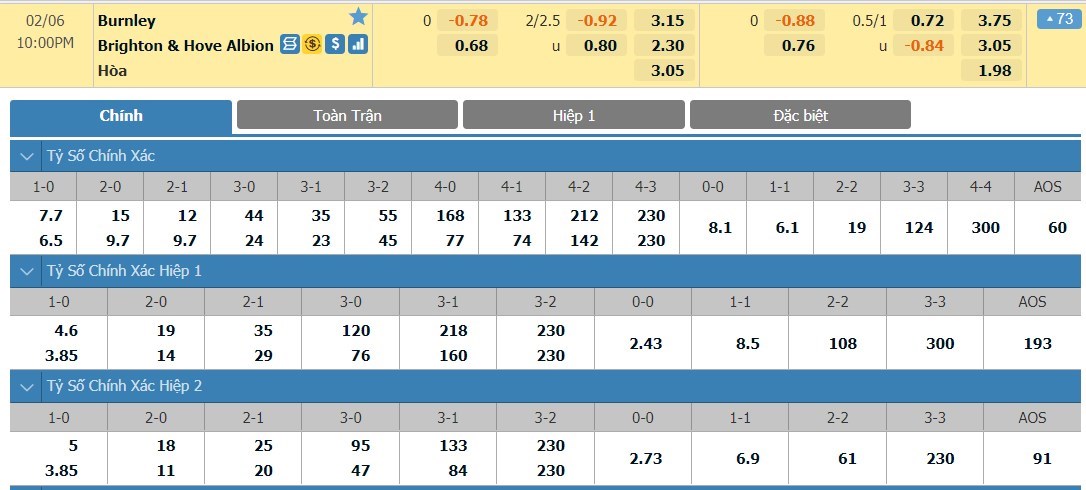 Xem tỷ lệ kèo cá cược bóng đá trực tuyến Burnley vs Brighton
