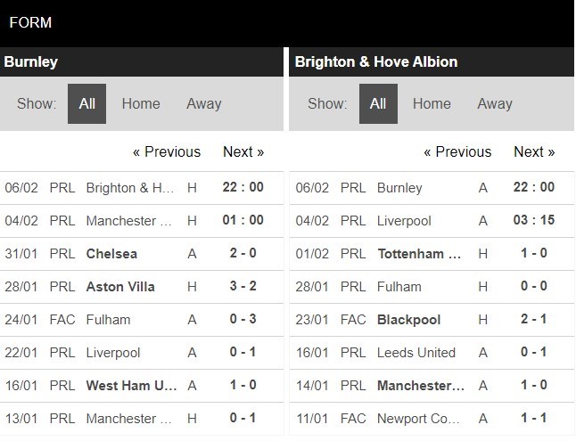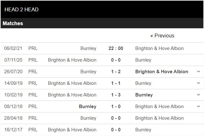 Thống kê đối đầu Burnley vs Brighton