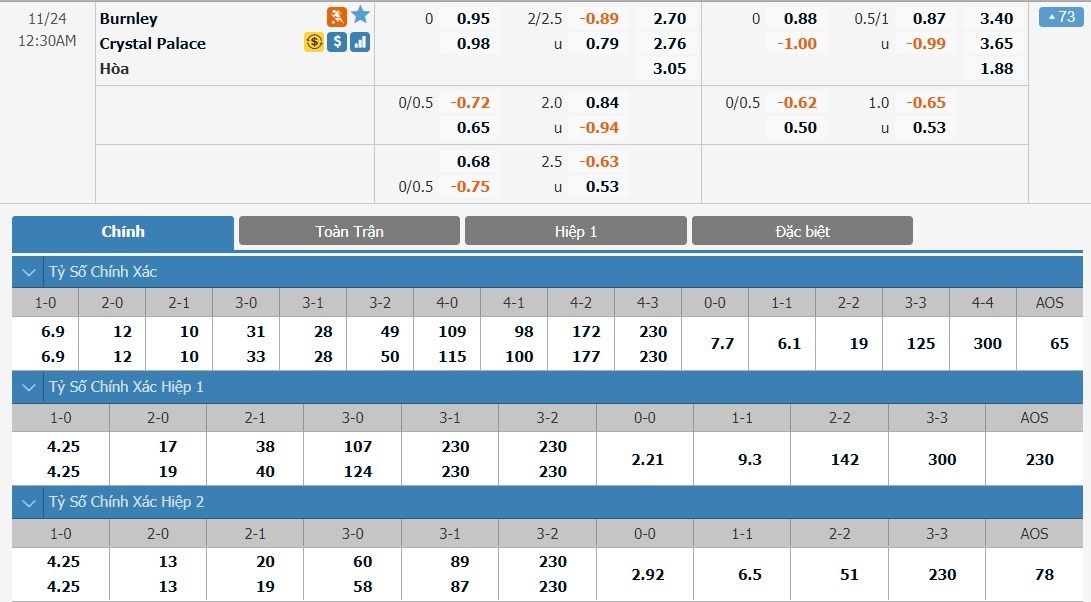 Xem tỷ lệ kèo cá cược bóng đá trực tuyến Burnley vs Crystal Palace