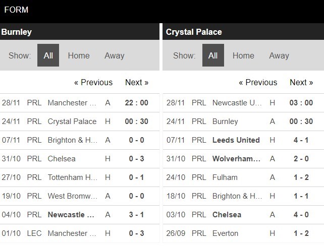 Thống kê phong độ Burnley vs Crystal Palace