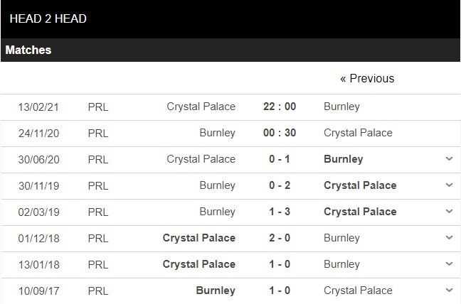 Thống kê đối đầu Burnley vs Crystal Palace