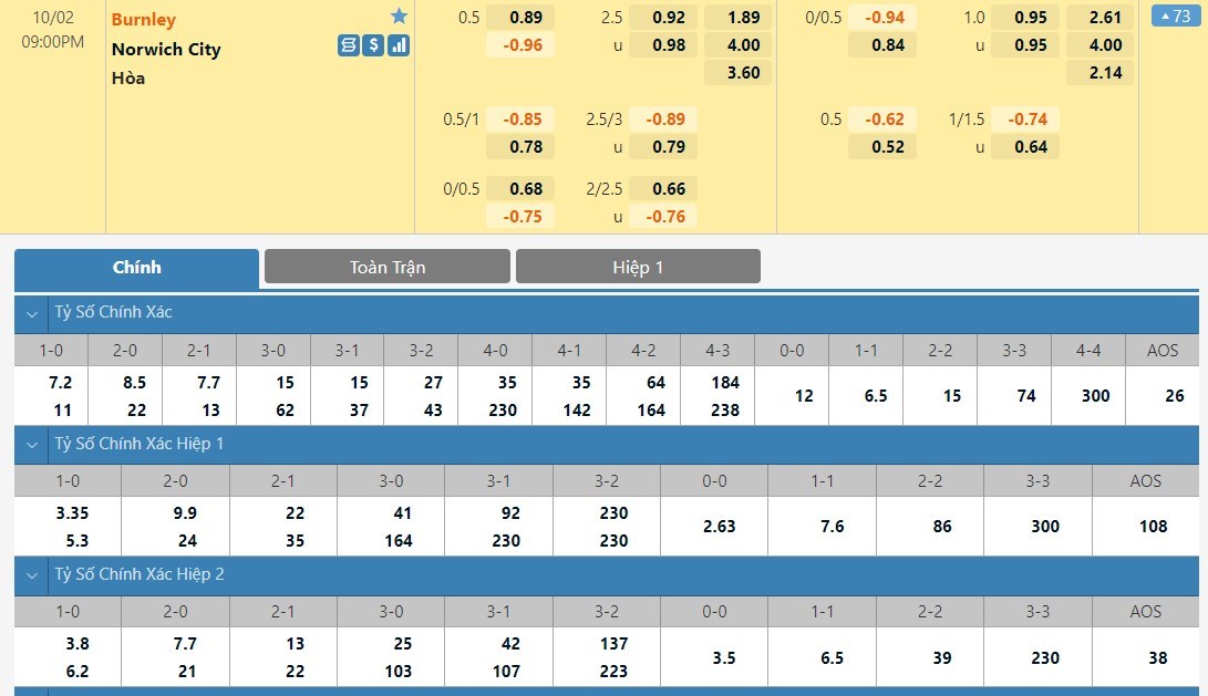 Tỷ lệ kèo cá cược bóng đá trận Burnley vs Norwich