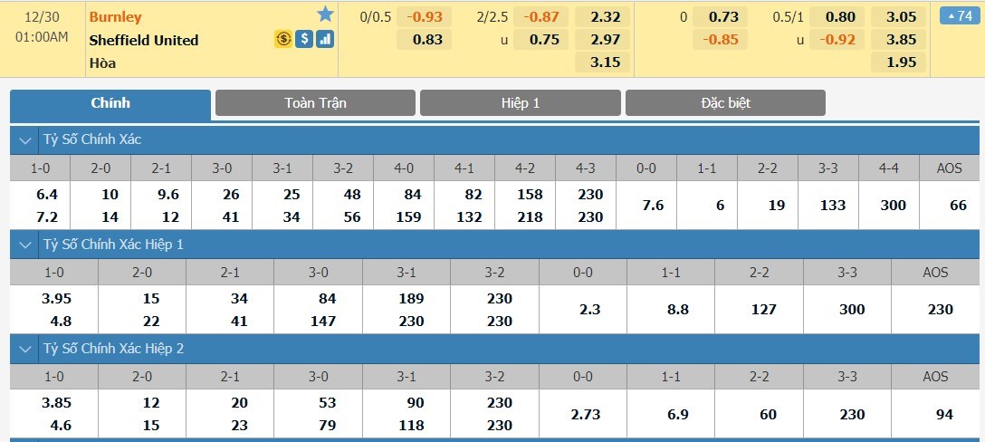 Tỷ lệ kèo cá cược bóng đá trực tuyến trận Burnley vs Sheffield United