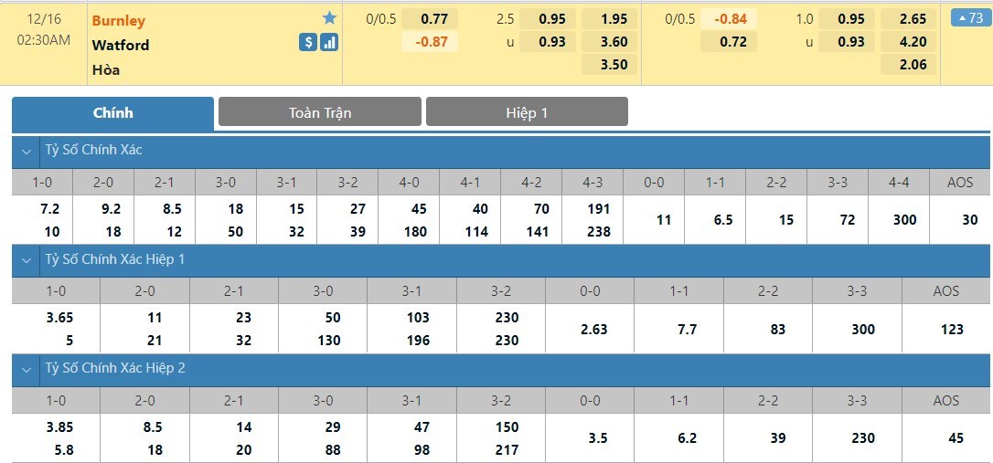 Tỷ lệ kèo cá cược bóng đá trận Burnley vs Watford