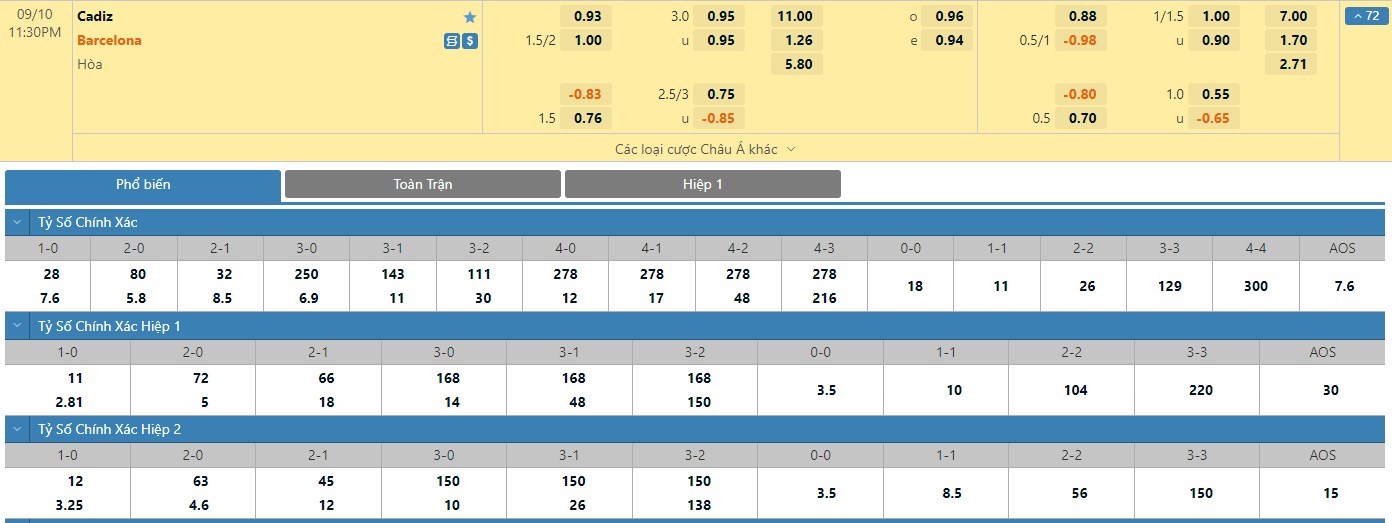 Tỷ lệ kèo cá cược bóng đá trực tuyến trận Cadiz vs Barcelona