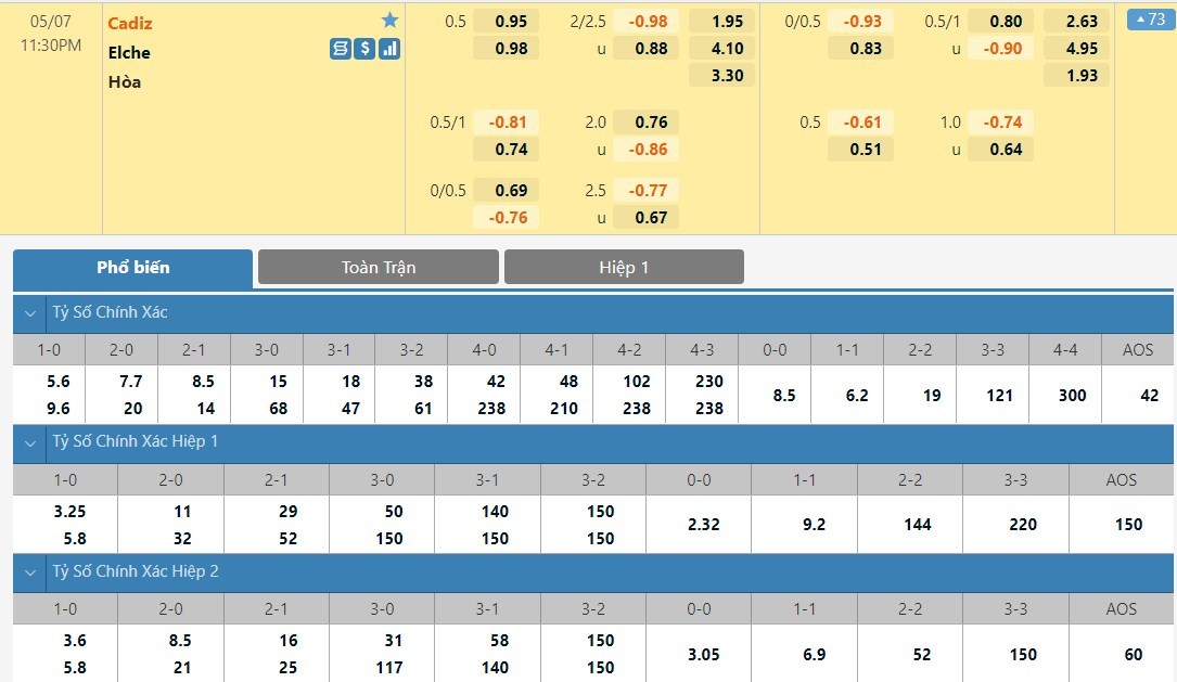 Tỷ lệ kèo cá cược bóng đá trận Cadiz vs Elche