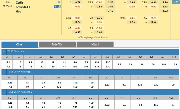 Xem tỉ lệ kèo cá cược bóng đá trực tuyến Cadiz vs Granada