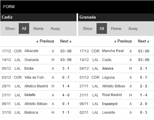 Thống kê phong độ Cadiz vs Granada