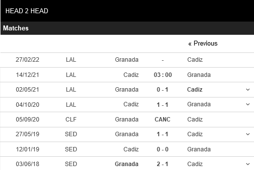 Thống kê đối đầu Cadiz vs Granada