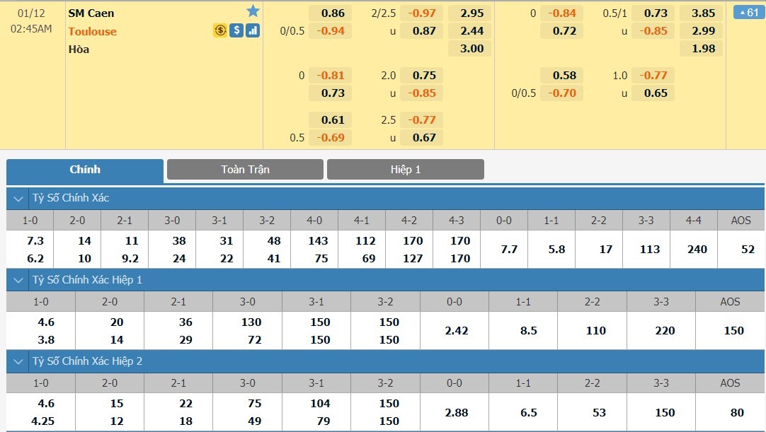 Tỷ lệ kèo cá cược bóng đá trận Caen vs Toulouse