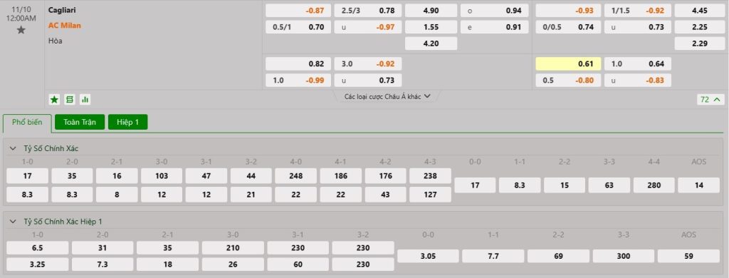 Tỷ lệ kèo cá cược bóng đá trực tuyến trận Cagliari vs AC Milan