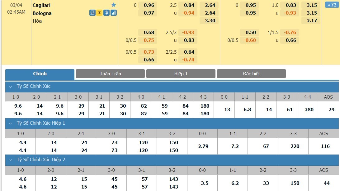 Tỷ lệ kèo cá cược bóng đá trận Cagliari vs Bologna