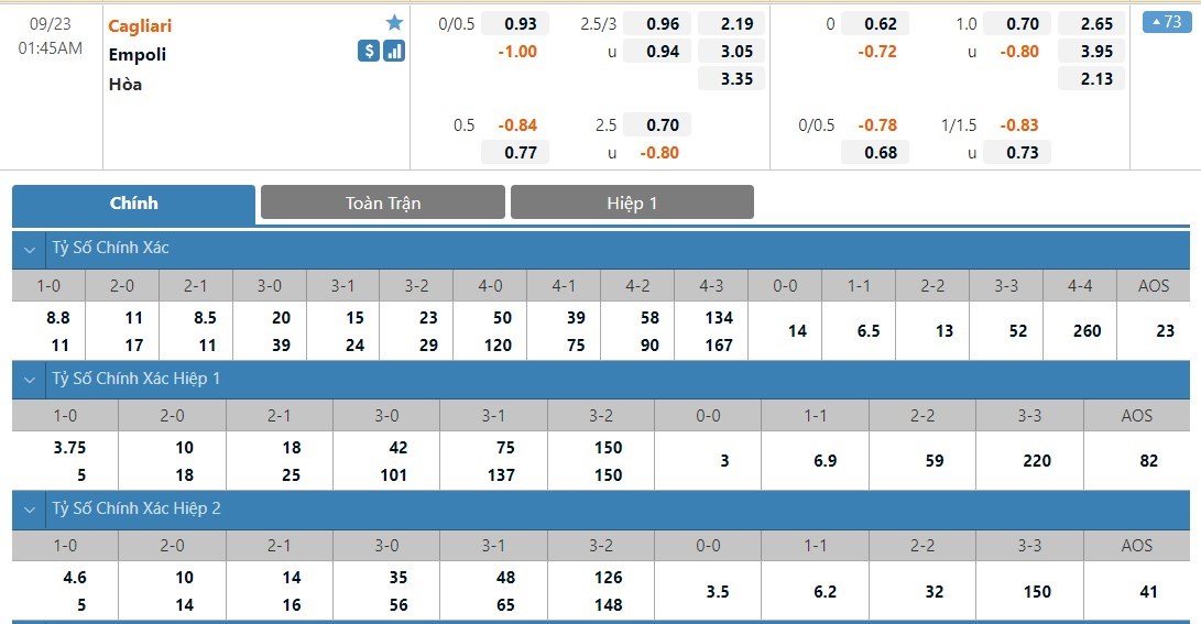 Tỷ lệ kèo cá cược bóng đá trận Cagliari vs Empoli