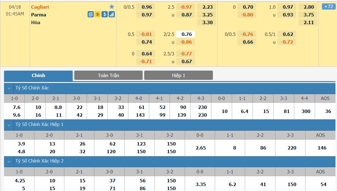 Tỷ lệ kèo cá cược bóng đá trực tuyến trận Cagliari vs Parma