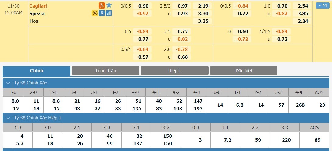 Tỷ lệ kèo cá cược bóng đá trực tuyến trận Cagliari vs Spezia